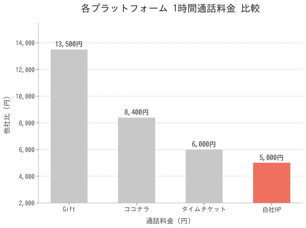 下は当方が所属しているGiftやココナラなどの、各プラットフォームからご依頼いただいた、1時間当たりの価格比較となっております。赤い棒グラフが当HPから1時間のご相談を受けた場合となっております。不器用な人間ですので、プラットフォームによってキャラ変しているわけではありません。どのプラットフォームからでも同じように誠実にクライアント様に向き合っておりますが、当HPよりご利用のお客様にはしっかりとしたフォローアップメッセージとアフターケア、次回もご利用の際には割引特典もご用意しております。