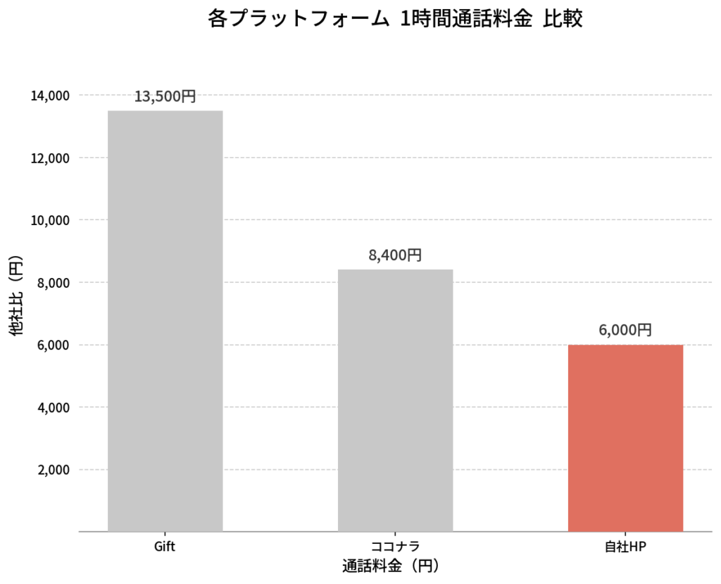 下は当方が所属しているGiftやココナラなどの、各プラットフォームからご依頼いただいた、1時間当たりの価格比較となっております。赤い棒グラフが当HPから1時間のご相談を受けた場合となっております。不器用な人間ですので、プラットフォームによってキャラ変しているわけではありません。どのプラットフォームからでも同じように誠実にクライアント様に向き合っておりますが、当HPよりご利用のお客様にはしっかりとしたフォローアップメッセージとアフターケア、継続してご利用の際には割引特典もご用意しております。